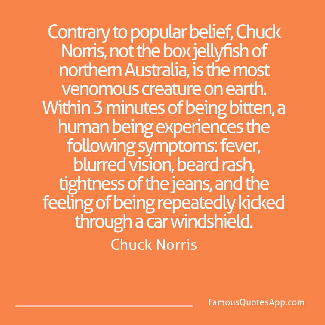 Contrary to popular belief, Chuck Norris, not the box jellyfish of northern Australia, is the most venomous creature on earth. Within 3 minutes of being bitten, a human being experiences the following symptoms: fever, blurred vision, beard rash, tightness of the jeans, and the feeling of being repeatedly kicked through a car windshield.